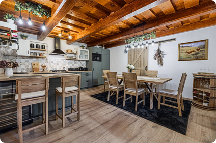 A teljesen felszerelt konyha és a hangulatos étkező lehetőséget ad közös főzésekhez, családi vagy baráti beszélgetésekhez.